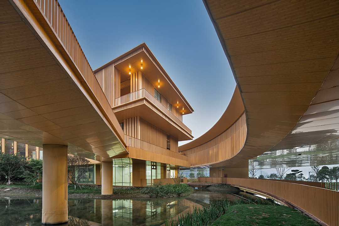Large panels maintain visual continuity and bring warmth to interiors. Slatted wall systems made from Moso bamboo can achieve strong acoustic performance as well.